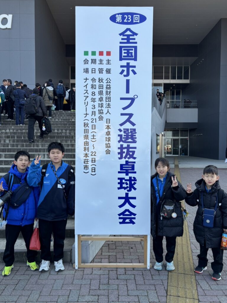 2026年3月21日(土)〜22日(日)第23回全国ホープス選抜卓球大会に出場しました。【 男子 】京都府選抜A 小畑 生智 (小2)京都府選抜B 山下 結生 (小6) 青木 稜 (小4)【 女子 】京都府選抜A 小畑 陽菜乃 (小5) ベスト16
